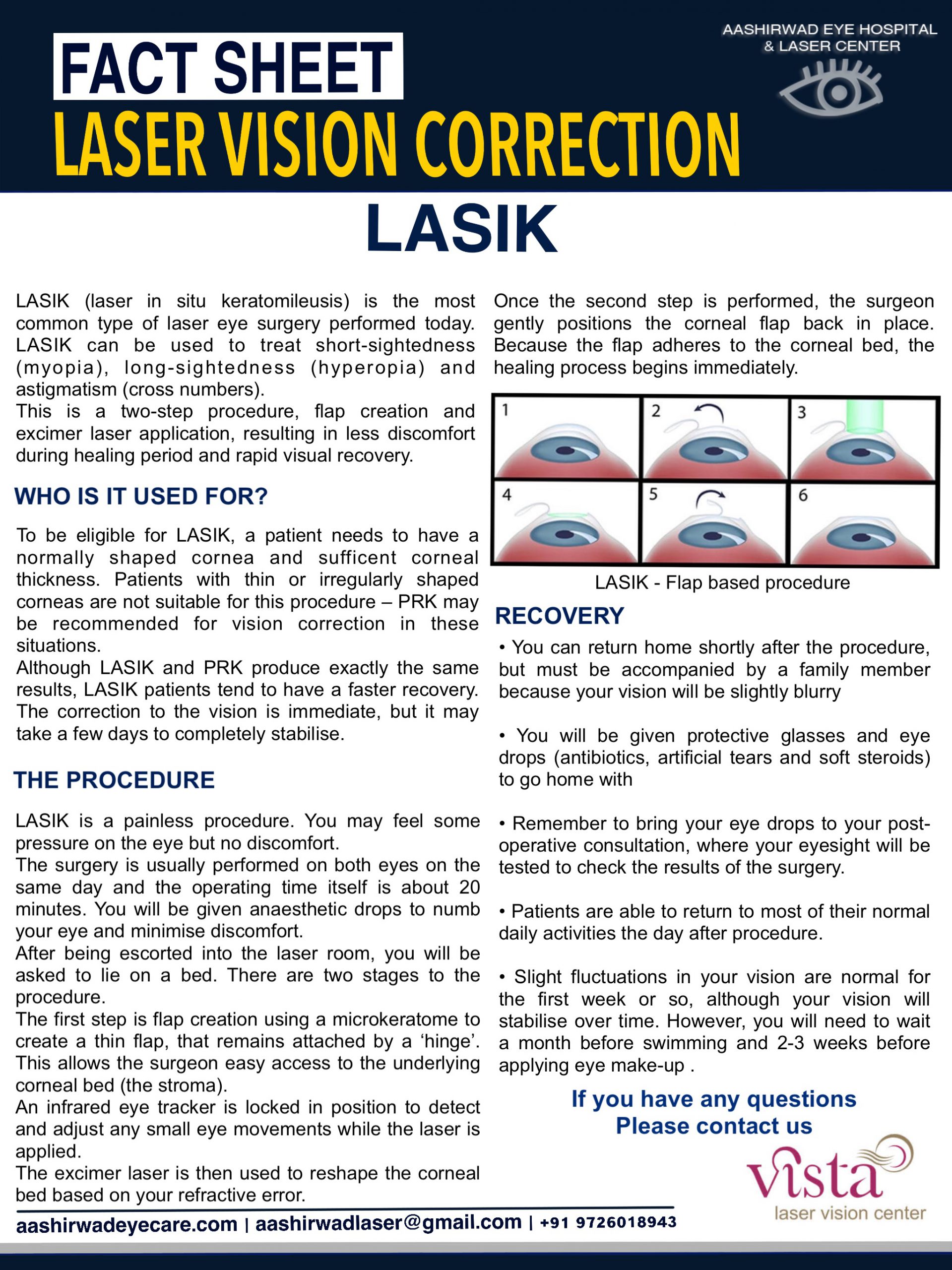 - LASIK, the most popular refractive technique, LASIK (Laser Assisted in Situ Keratomileusis), involves reshaping the cornea using a laser. To correct your vision, your surgeon first makes an ultra thin flap on the surface of the eye, through which he then uses an excimer laser to reshape your cornea. This flap is then returned to its original position, and your eyes heal on their own. For laser vision correction, it is regarded as the most efficient, exact, predictable, safe, and patient-friendly choice. It is suitable for patients with mild to moderate amount of myopia, hyperopia and astigmatism.